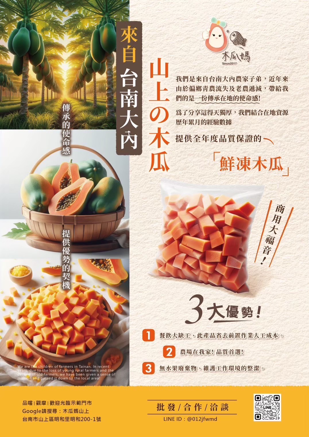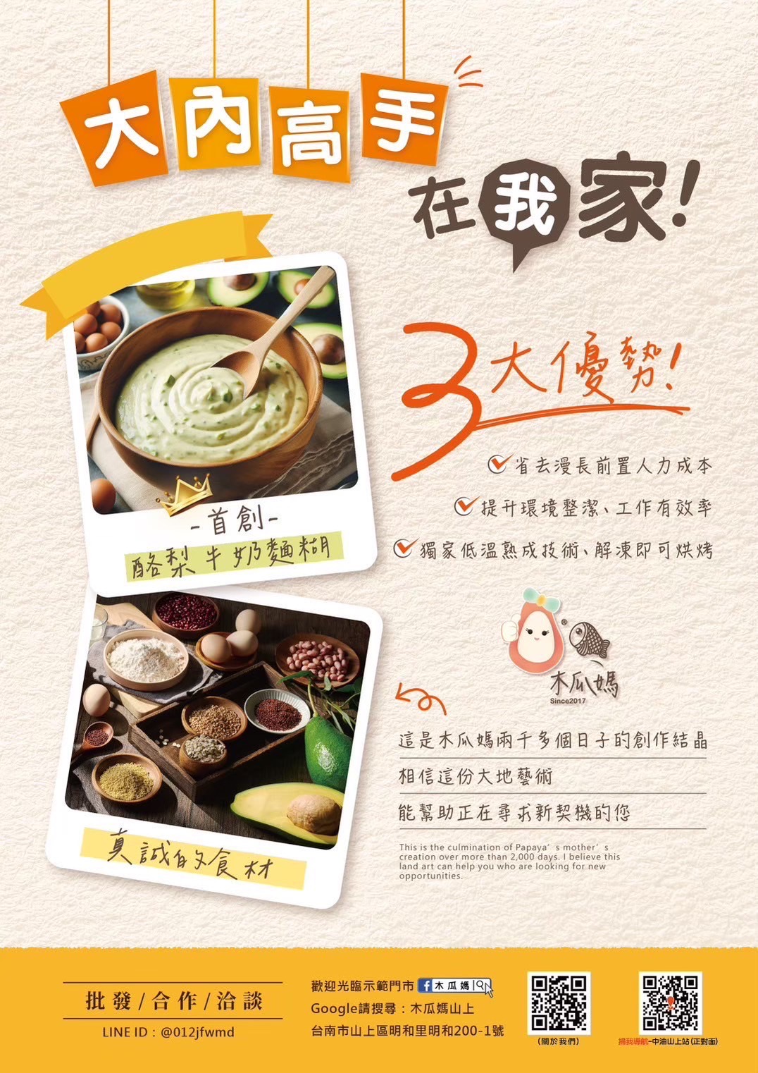 人稱「木瓜媽」的吳佩俞,從彰化嫁來台南,因為知道長輩的木瓜園 木瓜品質好.便開始想做點小生意 分擔家計。漂亮的果園 由夫家的三兄弟幫忙長輩打理 也因為是自家嚴格篩選 成為店裡木瓜牛奶好喝的來源。因緣際會下 承接了朋友的烤台,讓原先對烘焙就充滿熱愛的吳佩俞開啟了的研發之路。不只在外皮上耗時研發,連口味也是箇中滋味,不論是波霸奶酪的濃郁奶香,還是麻糬可可的柔軟香濃,起司奶酪的鹹甜交融,每一種口味都讓顧客感到驚豔擁有產地到餐桌的優勢,確保了木瓜的品質。雖然目前將心力著重在店內,但總會遇到許多人想前來取經。一句句由衷的感謝 是吳佩俞道不盡的感恩之心 開店做生意 跟多數人一樣 沒有捷徑 .而一路上顧客的支持 長輩的支持 也將帶領著這一家人 繼續前行。